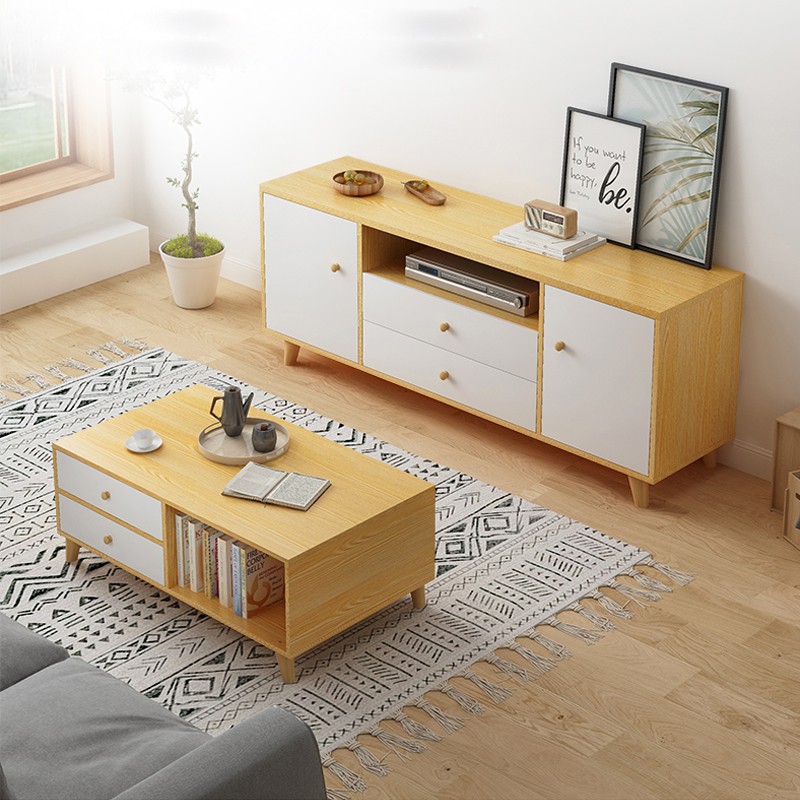 【好的家居】北歐簡約雙色客廳桌櫃組/淺木紋白抽客廳桌、電視櫃